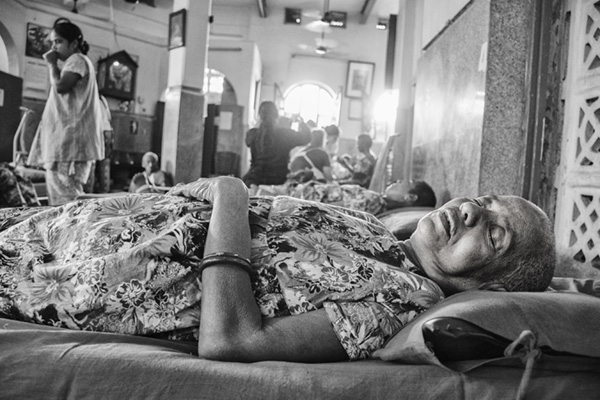En el sur de la ciudad de Calcuta se encuentra uno de los puntos más emblemáticos de la por su larga historia como núcleo de la religión hindú, así como por ser uno de los lugares desgraciadamente más desprotegido y marginales en la milenaria ciudad : Kalighat. Caminar por las calles del sector de Kalighat es adentrarse a un sinfín de símbolos contradictorios, pues al mismo tiempo que su colorido intenso ilumina una arquitectura fenomenal escondida entre cientos de puestos callejeros, uno se topa de frente con la marginación de las personas que habitan ese sector cuya realidad logra golpear a cualquier transeúnte ajeno a la vida cotidiana de este particular sitio, que también es conocido como el barrio rojo, y como casi cualquier barrio rojo de todo el mundo es relacionado con prostitución ilegal, violencia y marginación a gran escala con el plus especial que aquí en Calcuta a eso se le puede añadir una gran rivalidad ideológica, pues aunque este sitio alberga uno de los templos hindúes más emblemáticos, también la madre Teresa fundó una casa hogar católica que tiene una particularidad : Está hecha para aquellos que van a morir. No es fácil poder tener acceso a este pequeño templo de la muerte atendido por las hermanas de la caridad, orden religiosa fundada por la madre Teresa de Calcuta, pues últimamente esta organización se ha visto envuelta en diversos escándalos que involucran corrupción, venta de niños y discriminación hacia la población no cristiana y por lo tanto las puertas de este sitio suelen abrirse sólo para los voluntarios católicos extranjeros y en muy contadas ocasiones para los medios de comunicación, e incluso quienes hemos logrado tener acceso, éste sólo es permitido en ciertas partes y por determinado tiempo. Por ejemplo a mí sólo me otorgaron 5 minutos para tomar fotografías y en ningún momento se despegó de mí una monja de rostro rígido que con una sonrisa fría me indicaba a qué lugares podía tener permitido entrar. El refugio para los que van a morir es una casa de cuatro pisos donde la actividad con los internos se desarrolla en la planta principal, un piso dividido en una parte para los hombres y otro para las mujeres. En su mayoría son individuos que superan los dieciocho años a los cuales los últimos estragos de enfermedades terminales como el SIDA o el cáncer los mantiene postrados en un catre esperando el momento en que la vida se desvanezca de sus cuerpos. Algunos de ellos llegan por voluntad propia y otros son remitidos de otros refugios u hospitales cercanos en donde simplemente se les da la indicación de que sus días están tristemente contados. Pese a todas las dificultades y a la tremenda obviedad de que quienes residen en ese espacio están cercanos al punto final de su existencia, la mayoría logra comunicarse con una sonrisa e incluso piden ser fotografiados por su propio gusto, exhalando una leve risa cuando se miran a ellos mismos en la pantalla del aparato.
